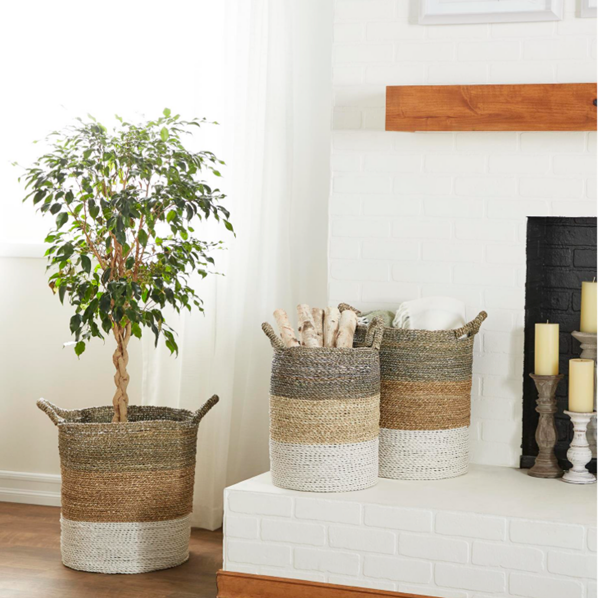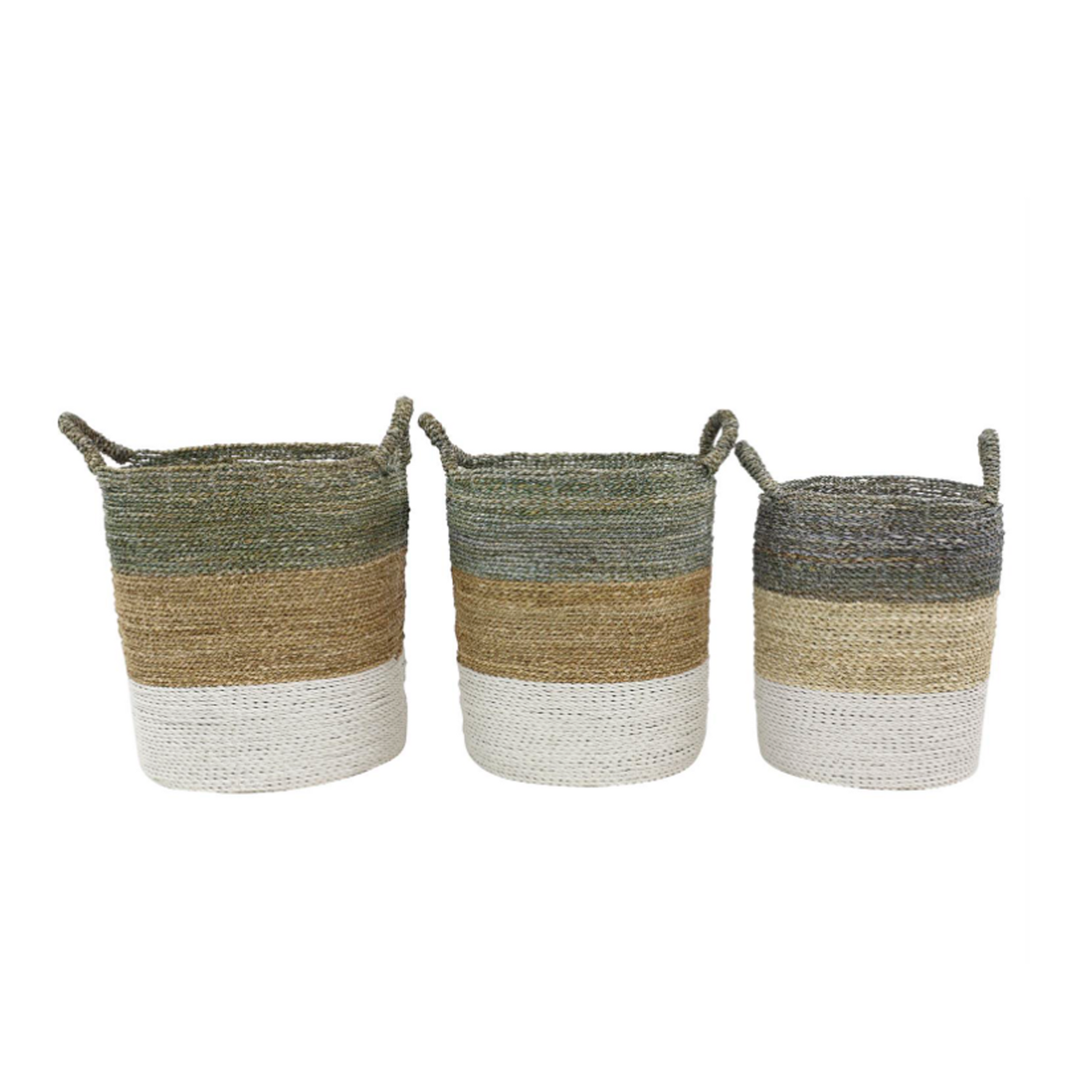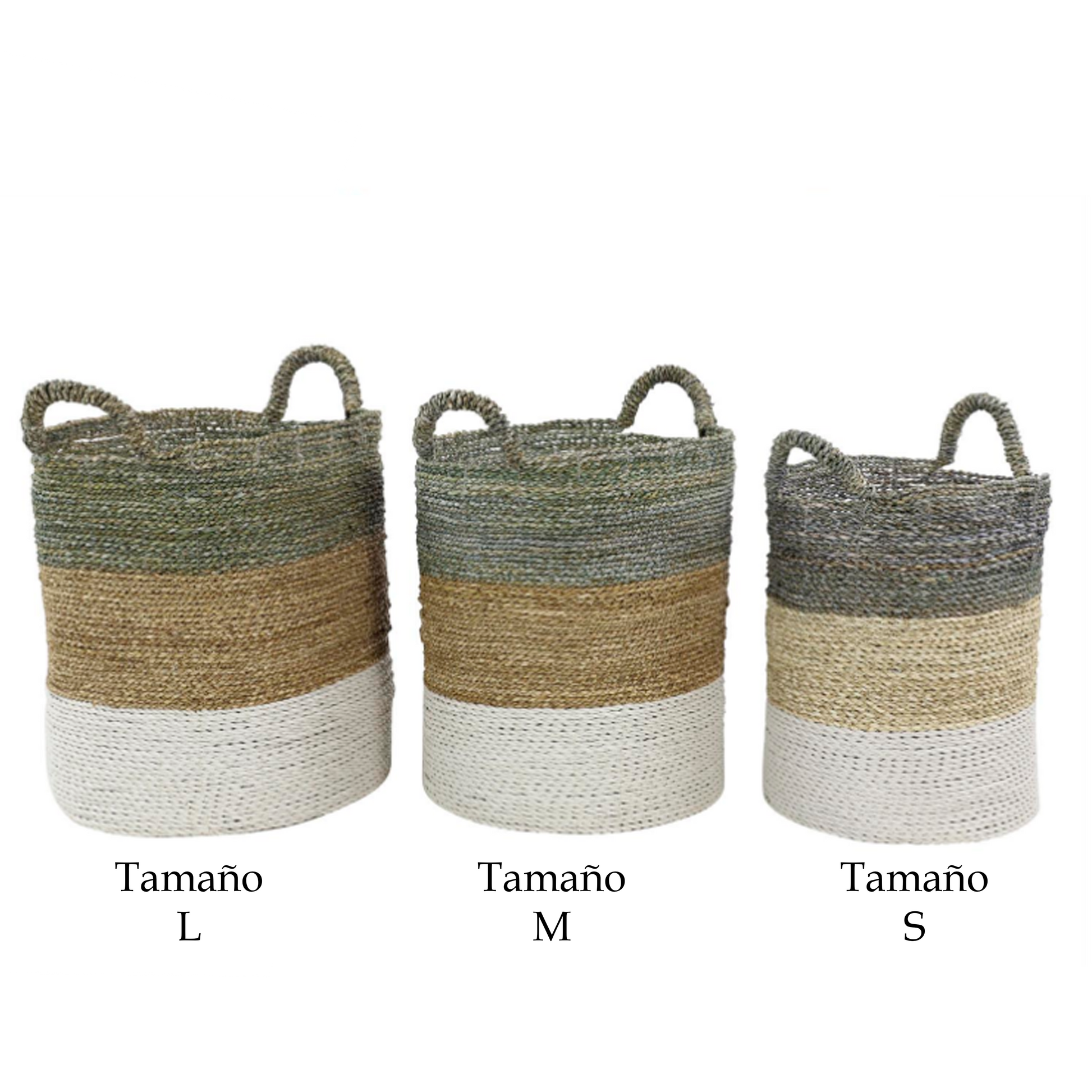 Canasto Ibiza Blanco disponible en tres tamaños, opción de almacenamiento decorativo y funcionales de color marrón está elaborado con junco marino de alta calidad, lo que garantiza durabilidad y atractivo estético.