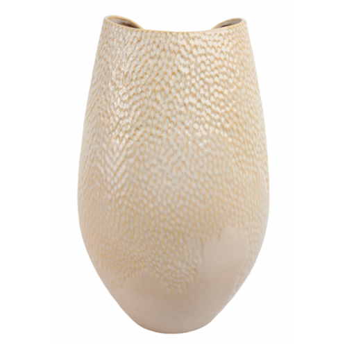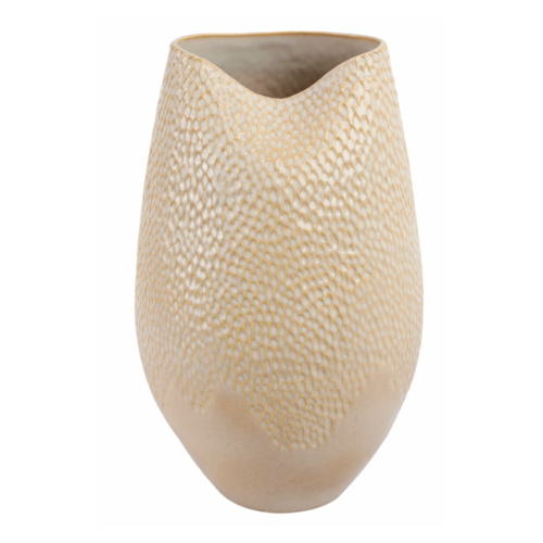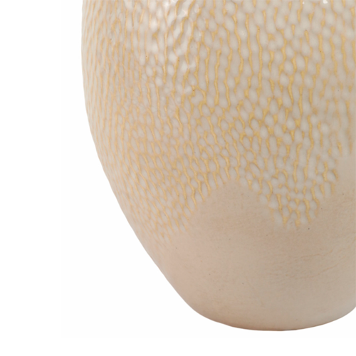 Esta pieza decorativa está elaborada en cerámica en tono claro, con relieves y detalles en acabado dorado que realzan su carácter artesanal. Ideal para complementar mesas, repisas o arrimos, funcionando como acento decorativo que suma textura y calidez al ambiente.