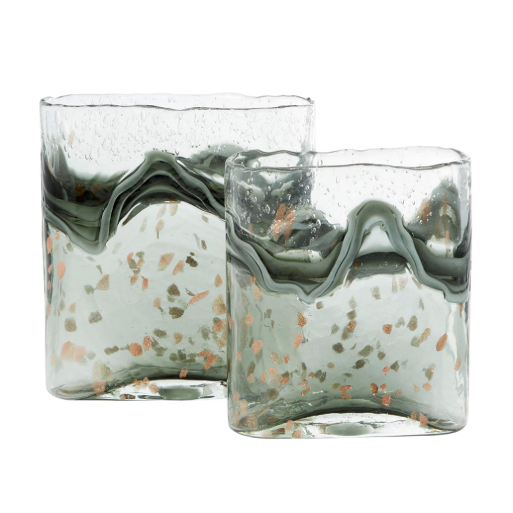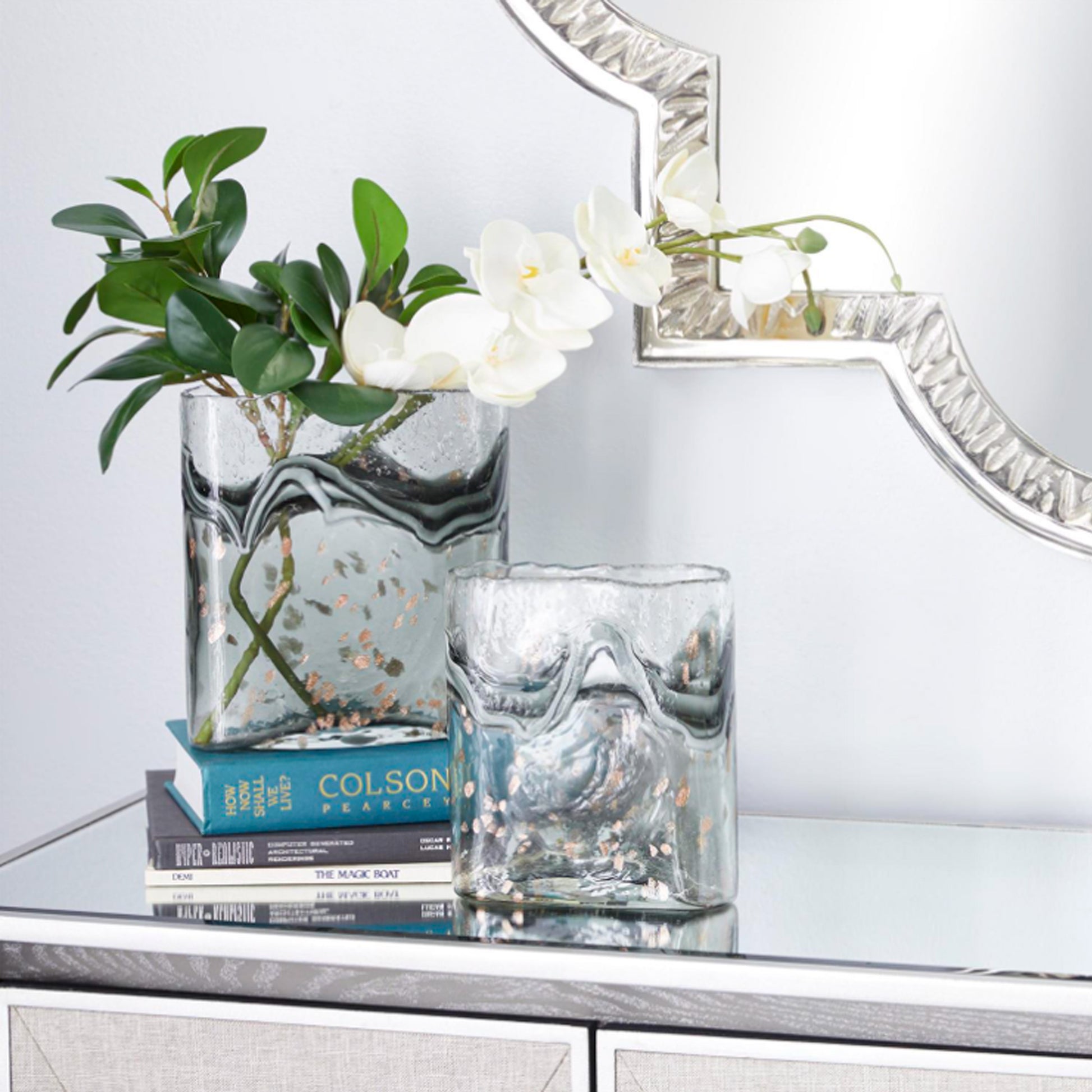 Abstracto e impactante, este jarrón decorativo gris claro está hecho de metal moldeado para un diseño duradero. El jarrón de papel maché cuenta con dos asas cuadradas y una forma de tres niveles, ofreciendo un toque único y moderno a los estilos tradicionales.