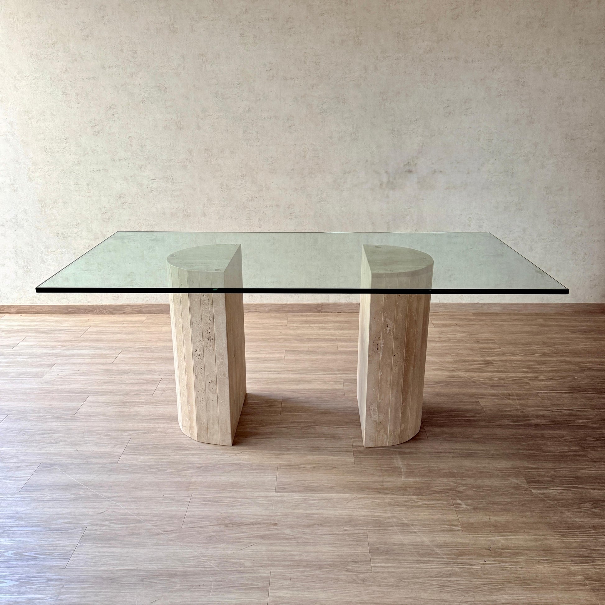Mesa de comedor Trípoli combina la calidez de la transparencia del vidrio con la solidez del mármol travertino. Un diseño que invita a reunirse, a compartir y a disfrutar, todos los días, como si fueran únicos. Y lo mejor es que podemos fabricarlo a la medida que necesites, para que se adapte perfectamente a tu espacio