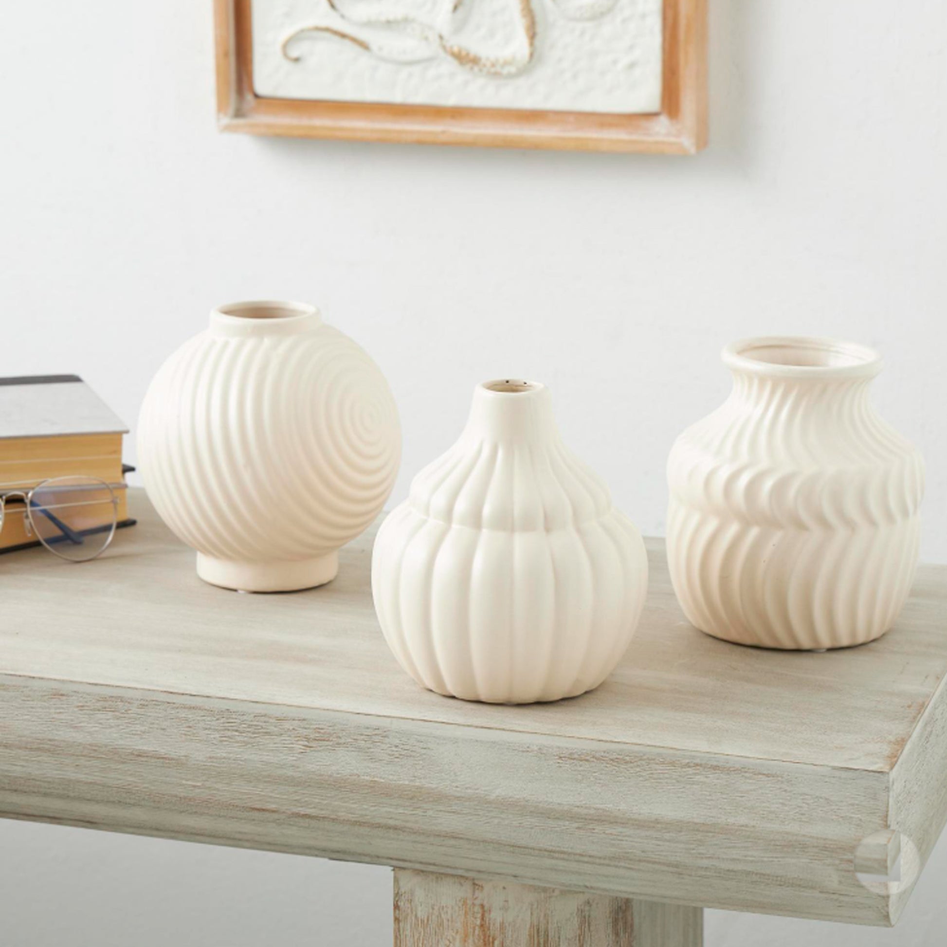Hecho de cerámica de alta calidad, este juego de jarrones decorativos de color crema es duradero y elegante.