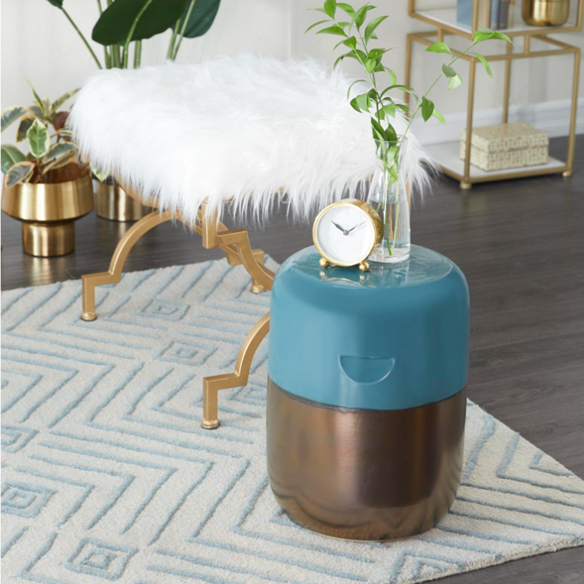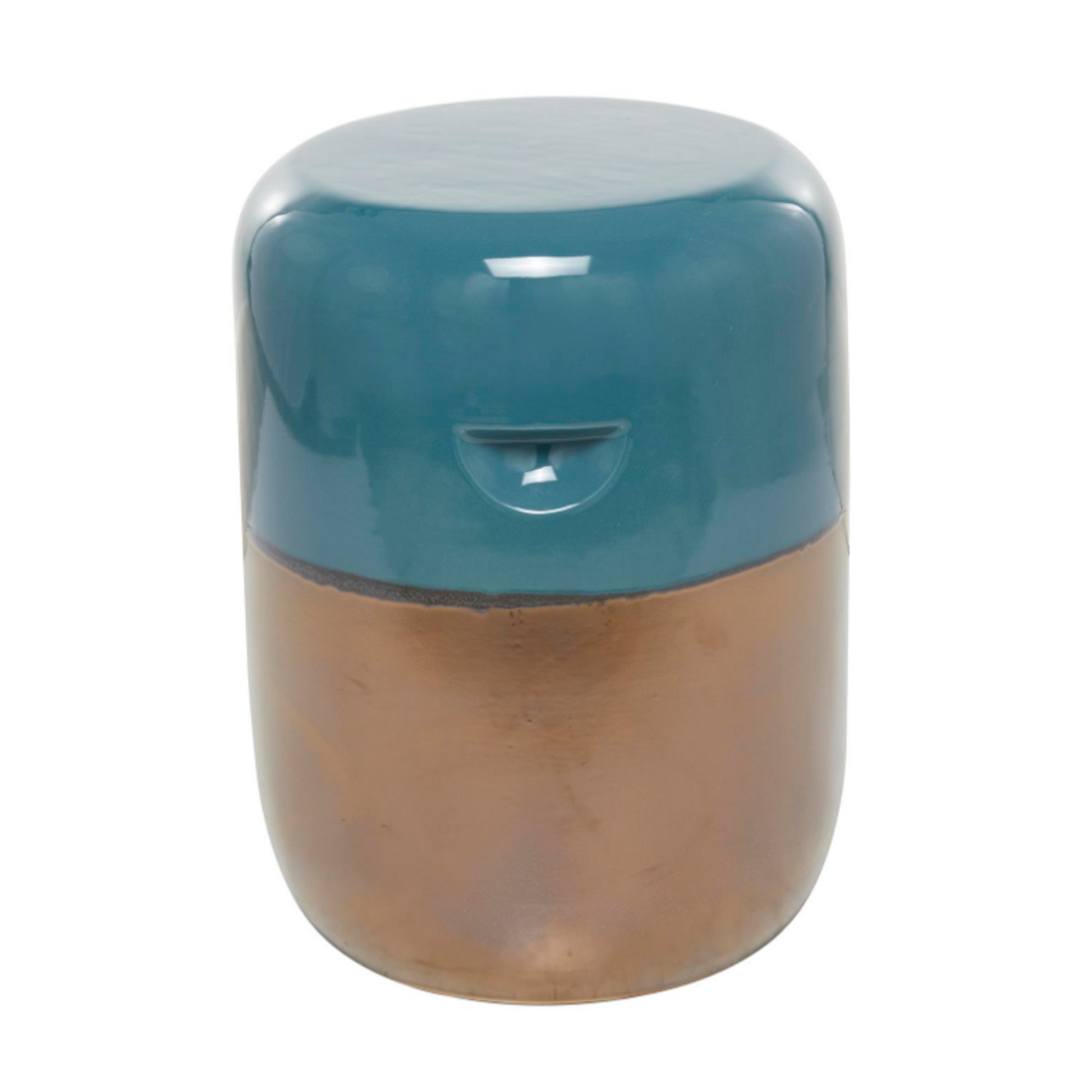 Piso redondo azul aguamarina hecha de gres puro. Bicolor luce un acabado cerámico de alto brillo en azul aguamarina y bronce dorado.