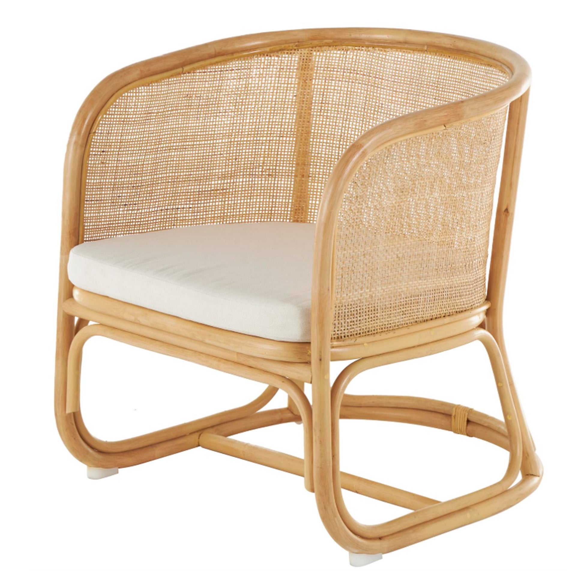 La silla de acento de ratán cuenta con un respaldo redondeado bellamente tejido y viene con un cojín de tela blanca para mayor comodidad