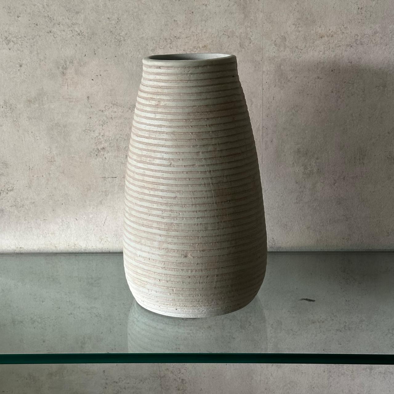 Vasija decorativa elaborada en resina blanca, trabajada a torno y ornamentada con delicadas líneas horizontales talladas que recorren toda su altura. Su diseño sobrio y contemporáneo aporta textura y equilibrio visual, ideal para ambientes modernos y minimalistas.