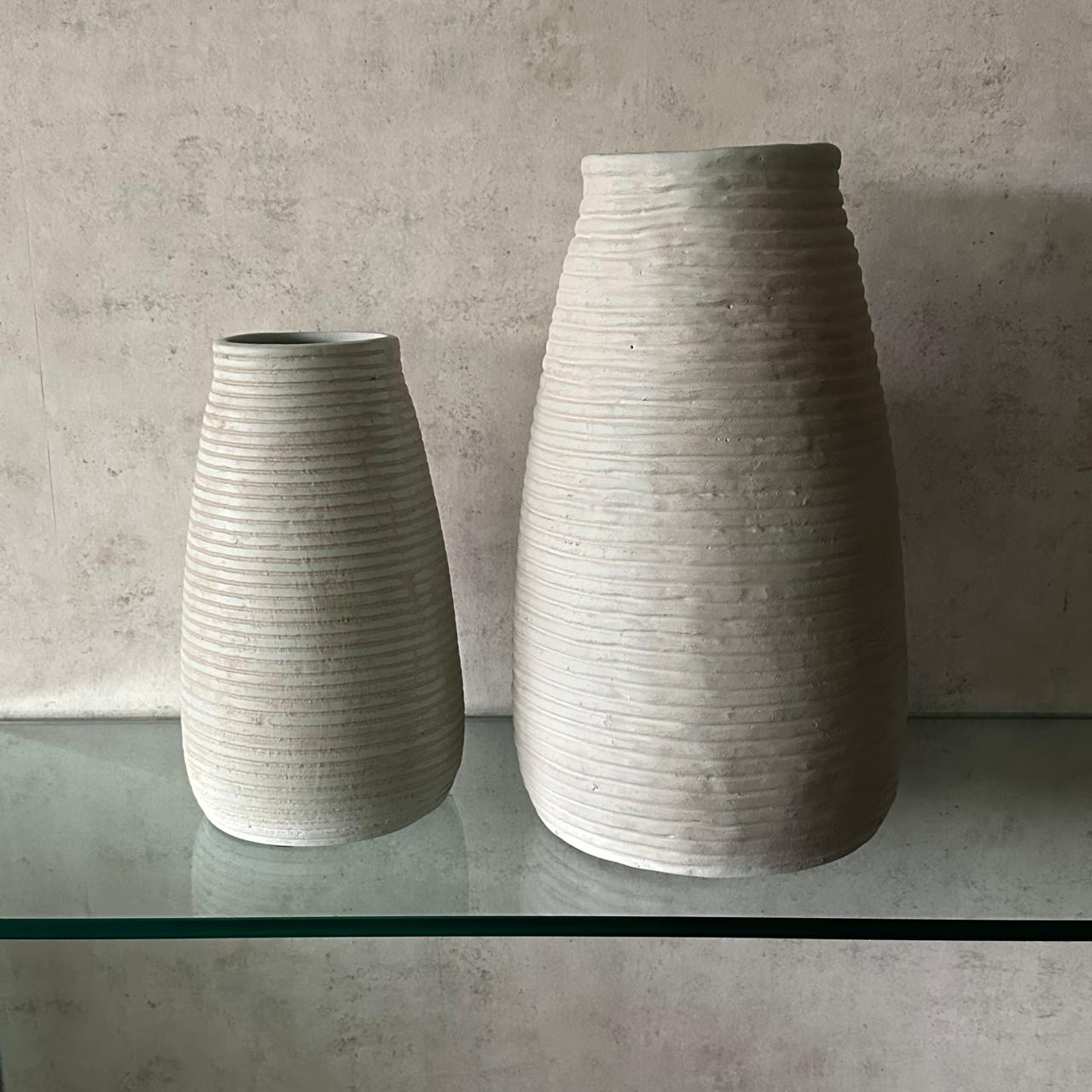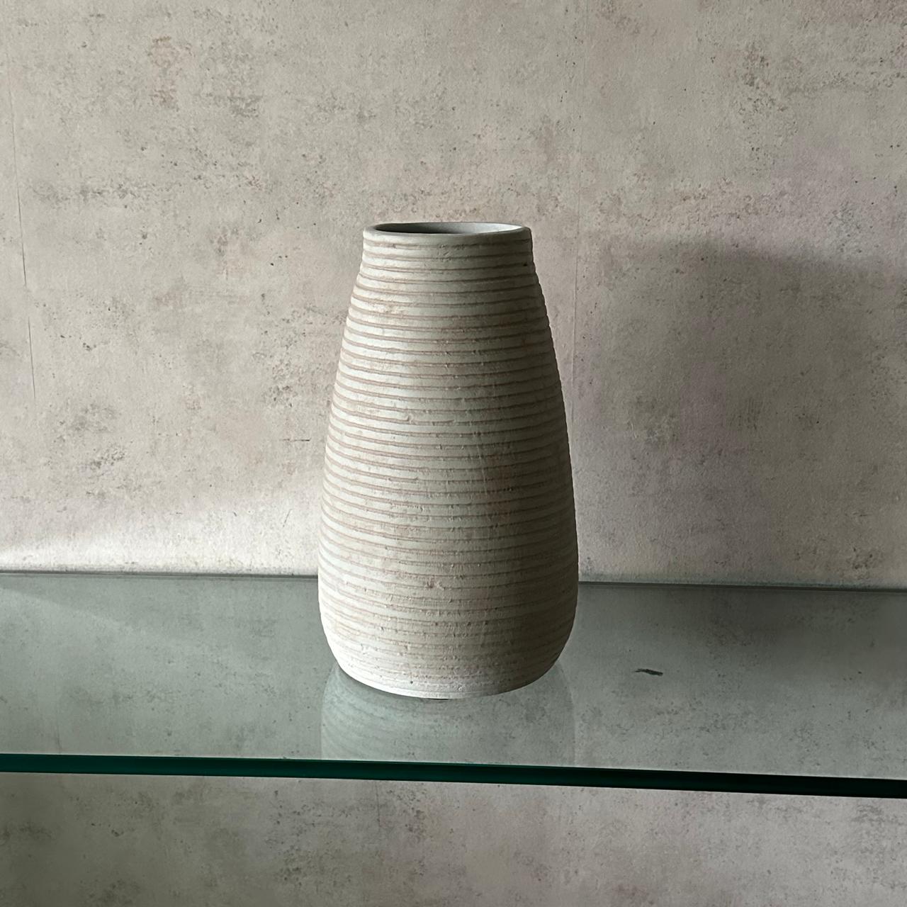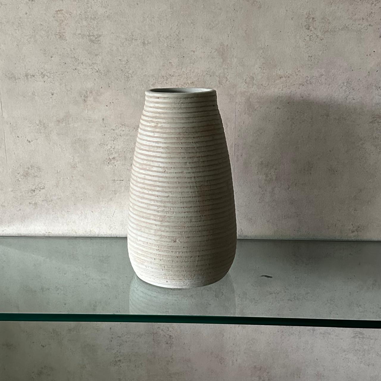 Vasija decorativa elaborada en resina blanca, trabajada a torno y ornamentada con delicadas líneas horizontales talladas que recorren toda su altura. Su diseño sobrio y contemporáneo aporta textura y equilibrio visual, ideal para ambientes modernos y minimalistas.