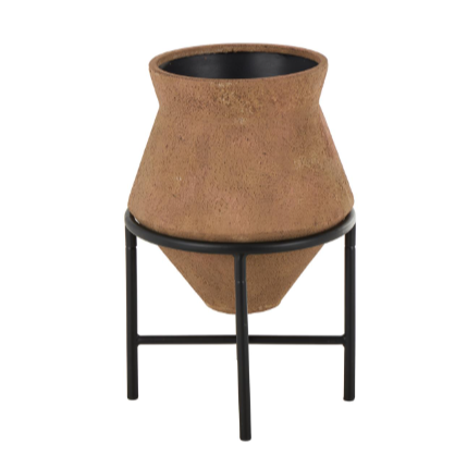 Este jarrón rústico cónico de intenso color marrón tiene un acabado texturizado, soldado de hierro resistente y se coloca sobre un soporte un negro.