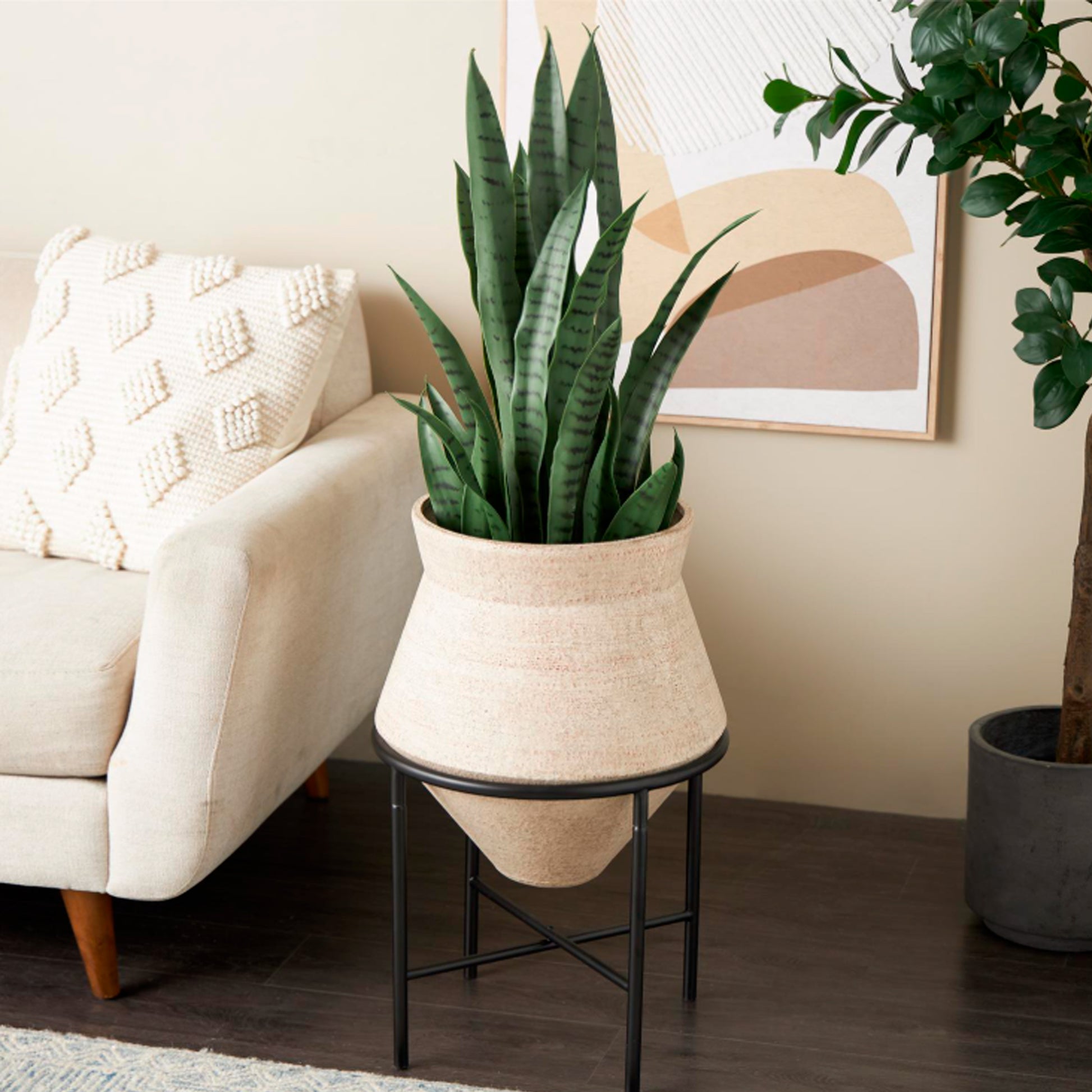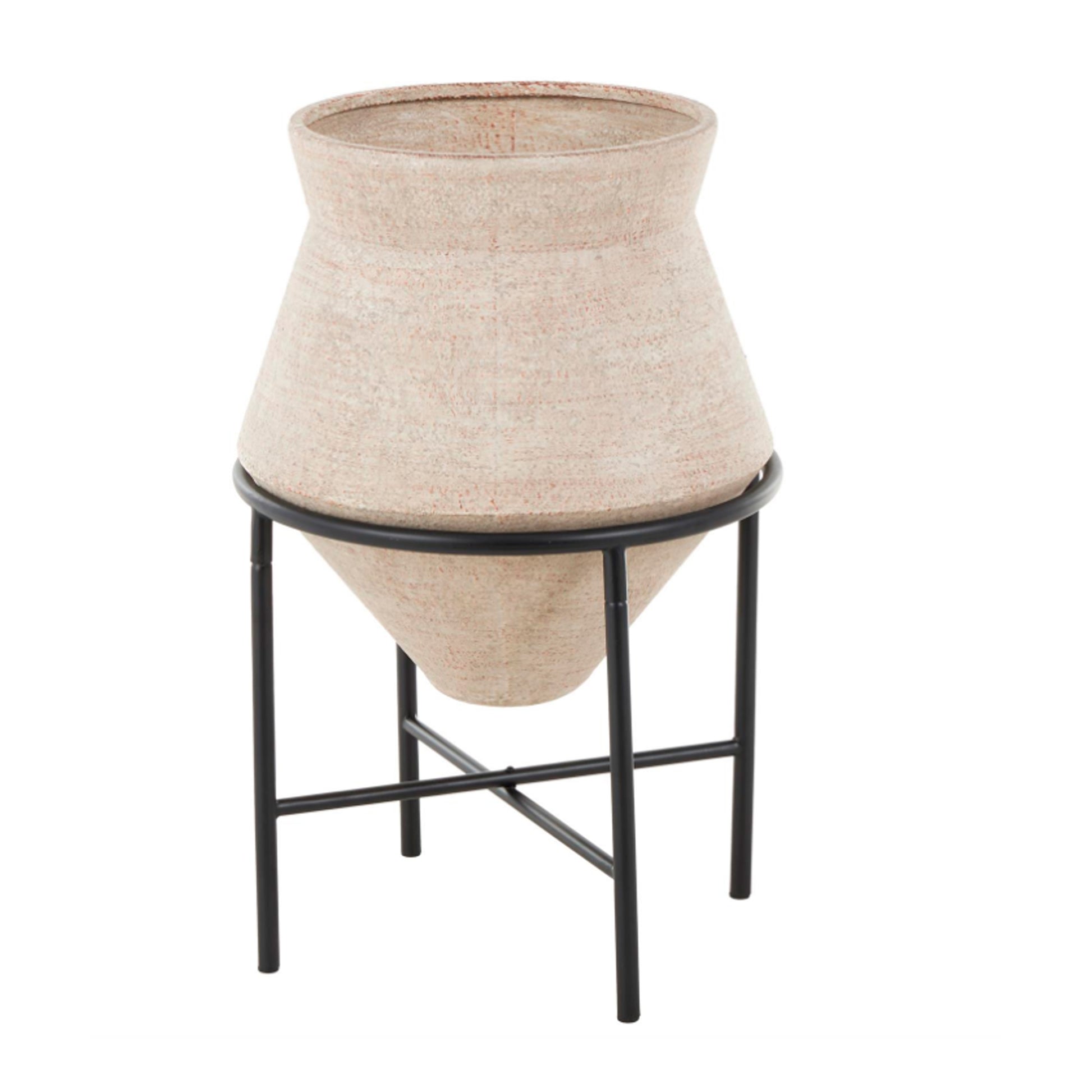 Plantero diseñado con una belleza rústica y un encanto natural que crea una atmósfera acogedora. Decoración soldada de hierro resistente, se coloca sobre un soporte.
