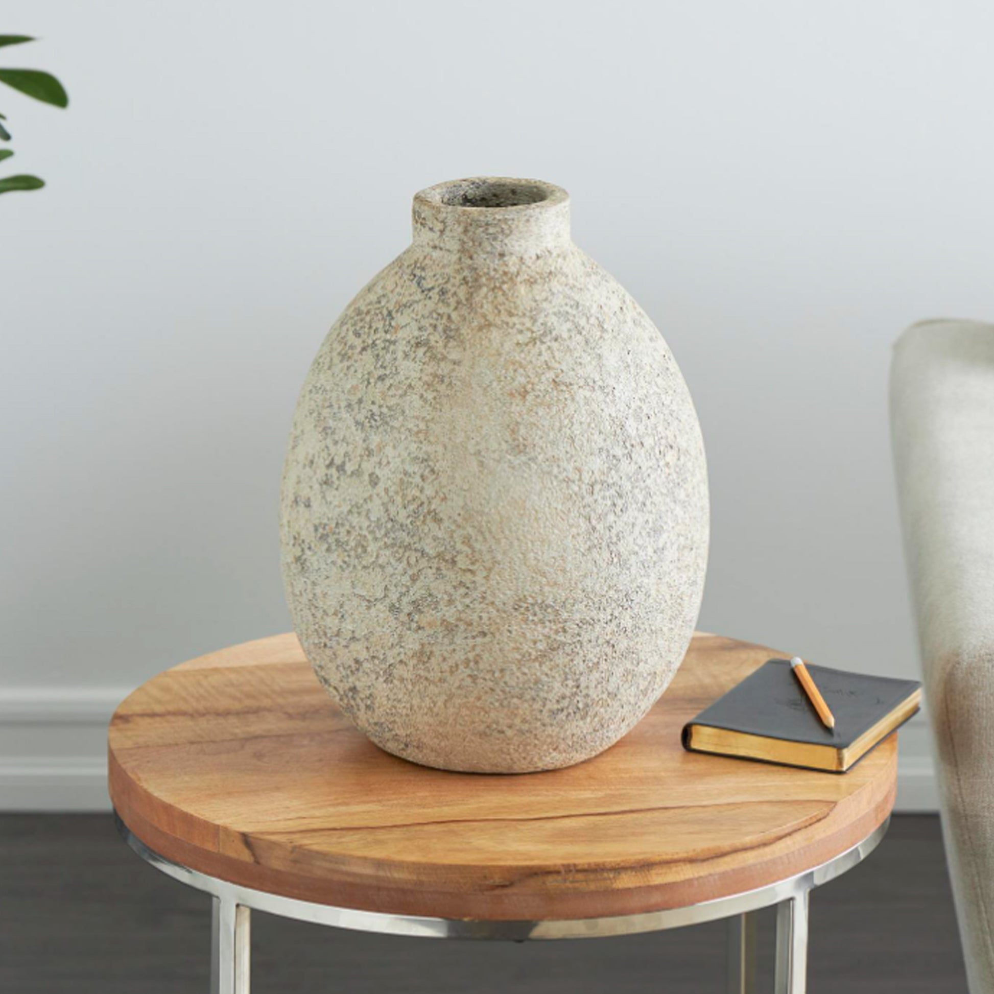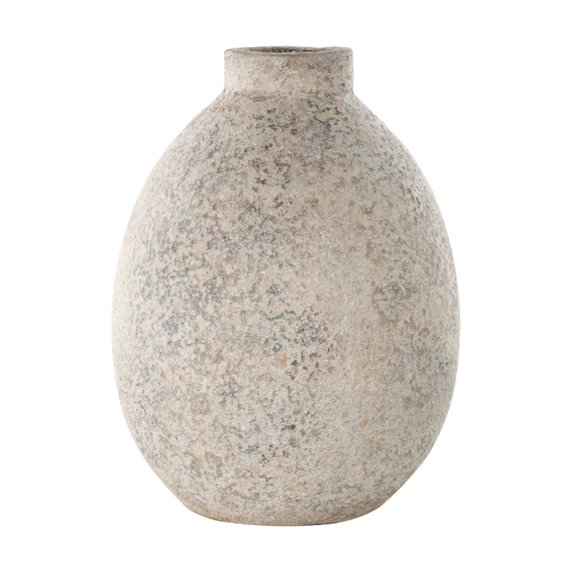 Vasija Burgos redonda Elaborada únicamente con arcilla, este jarrón decorativo muestra la belleza y autenticidad de este material tradicional, exhibe un encantador color crema, acentuado por un acabado desgastado que imparte un encanto vintage y desgastado por el tiempo