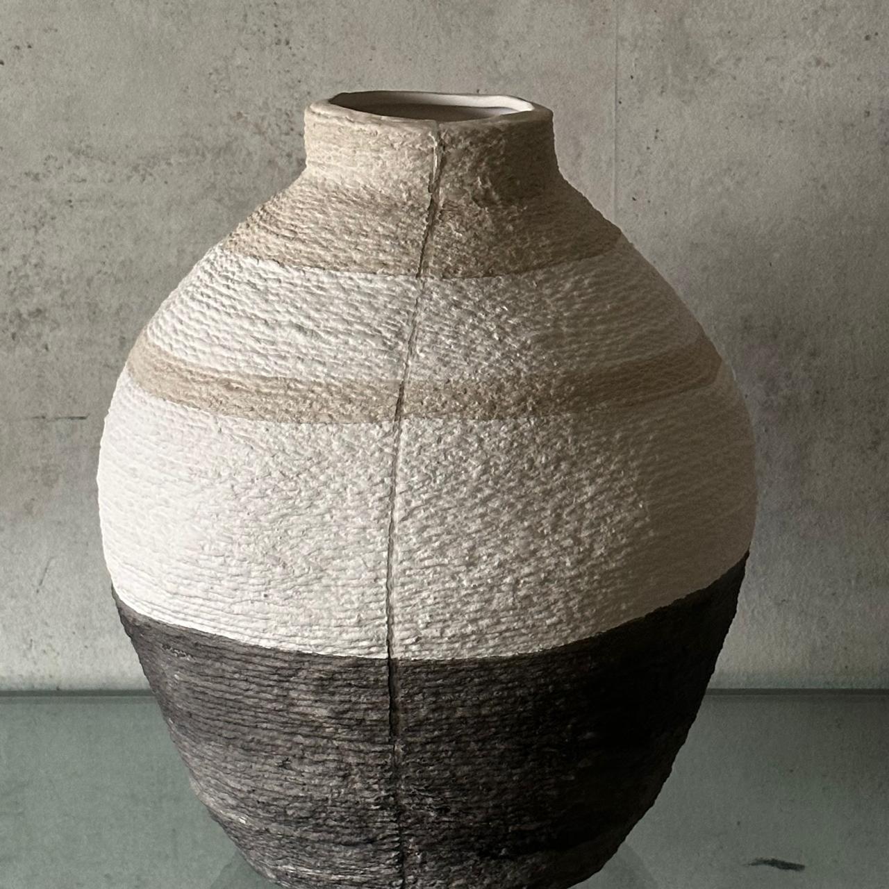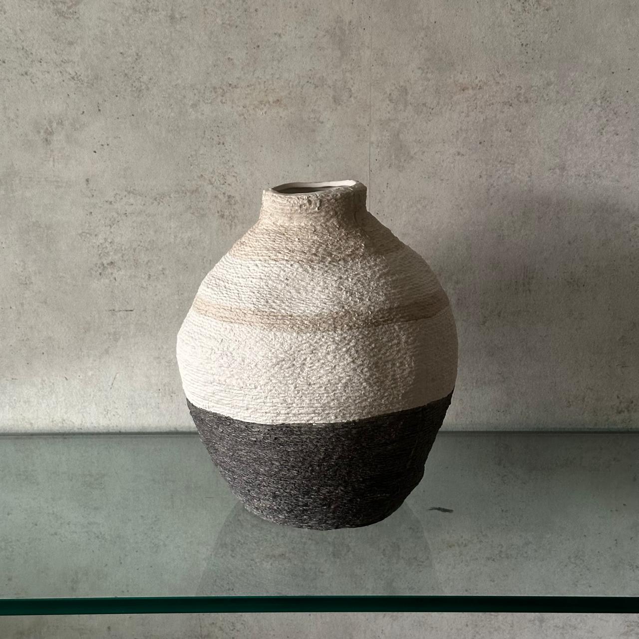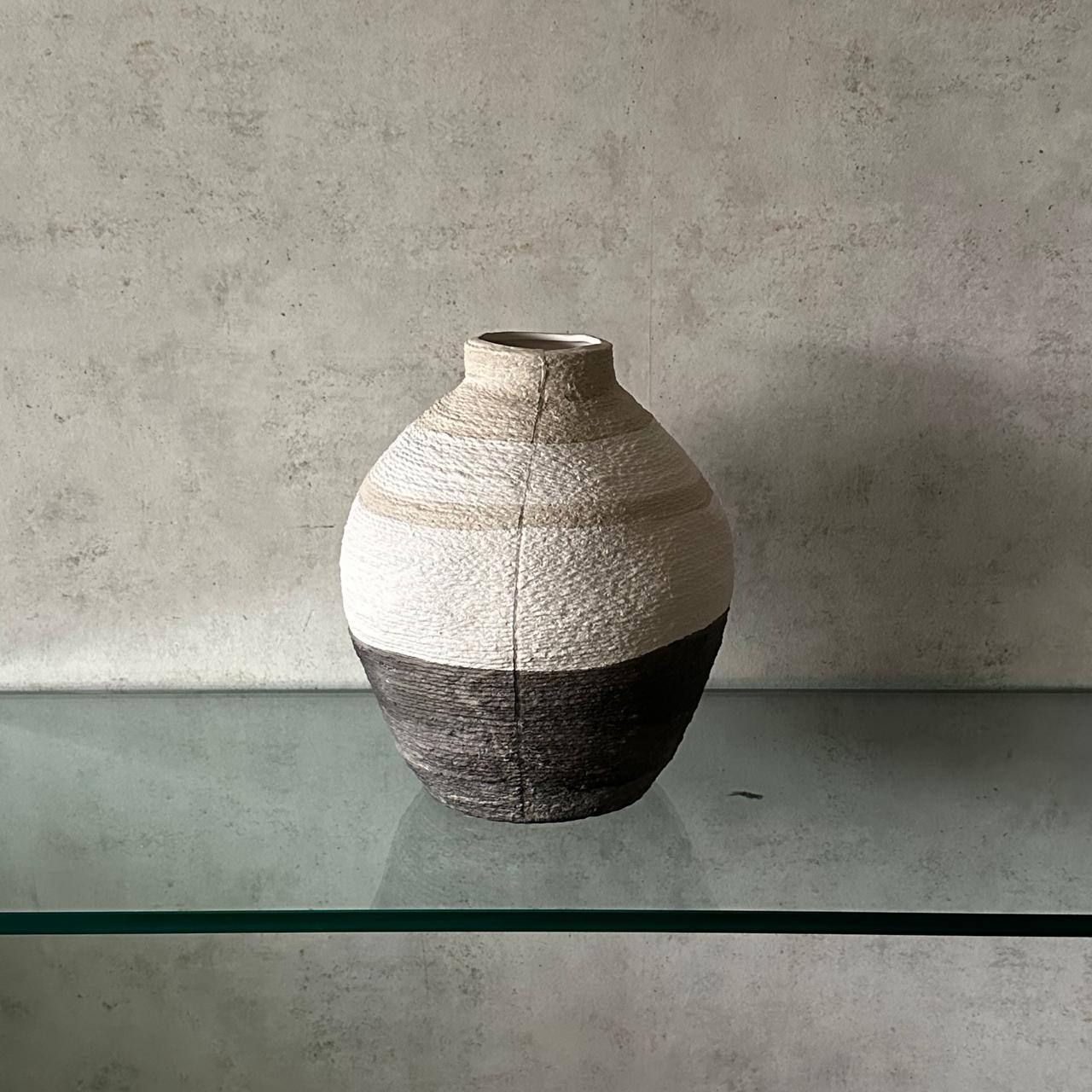 Vasija decorativa elaborada en fibra, con acabado en blanco y gris. Su diseño presenta rayas horizontales que recorren toda la pieza, aportando textura y un estilo fresco de inspiración mediterránea, ideal para interiores y exteriores cubiertos.