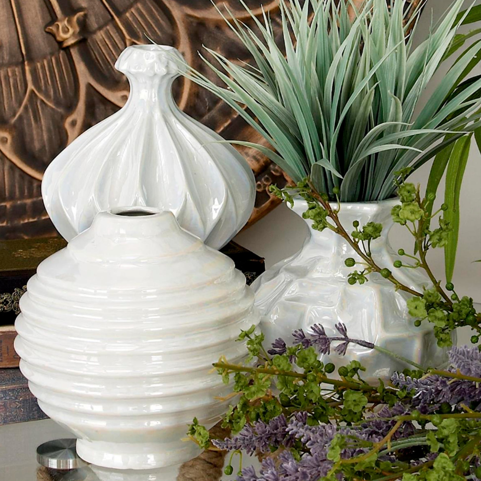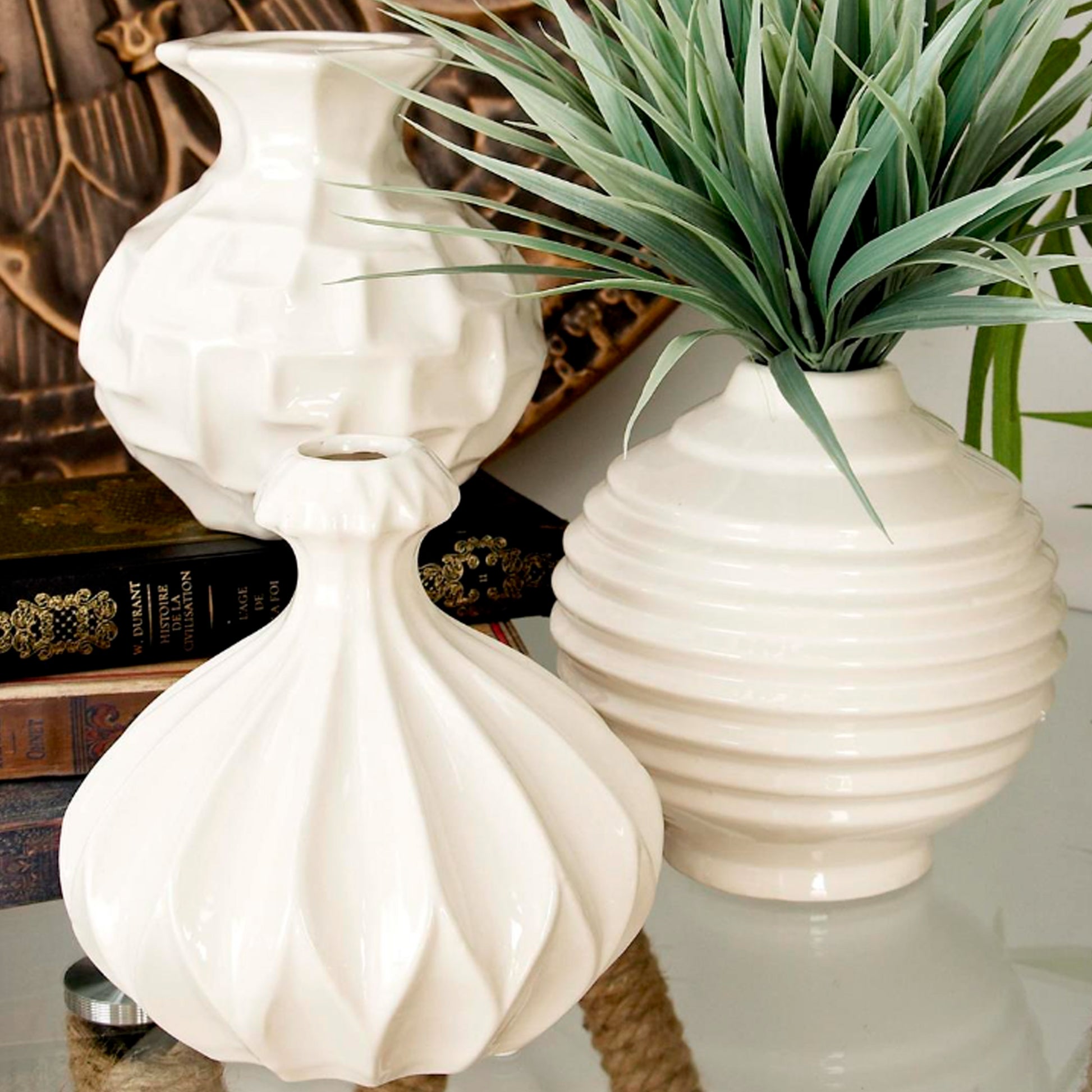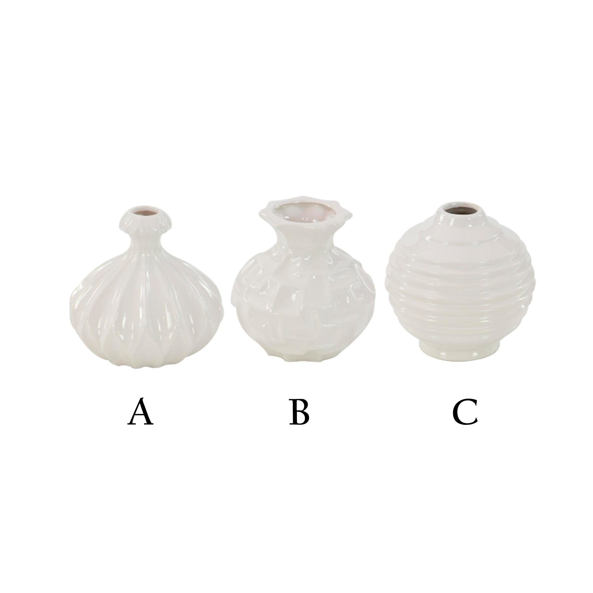 Vasija Mini Ibiza de cerámica blanca y pulida son ideales para flores artificiales tienen una forma redonda con patrones geométricos que complementan maravillosamente cualquier arreglo floral.